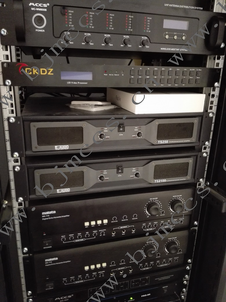 該項目使用了MCCS(音視美)多個設(shè)備。包括:無線觸摸屏控制界面、多媒體中央控制系統(tǒng)、無線手拉手會議跟蹤系統(tǒng)。